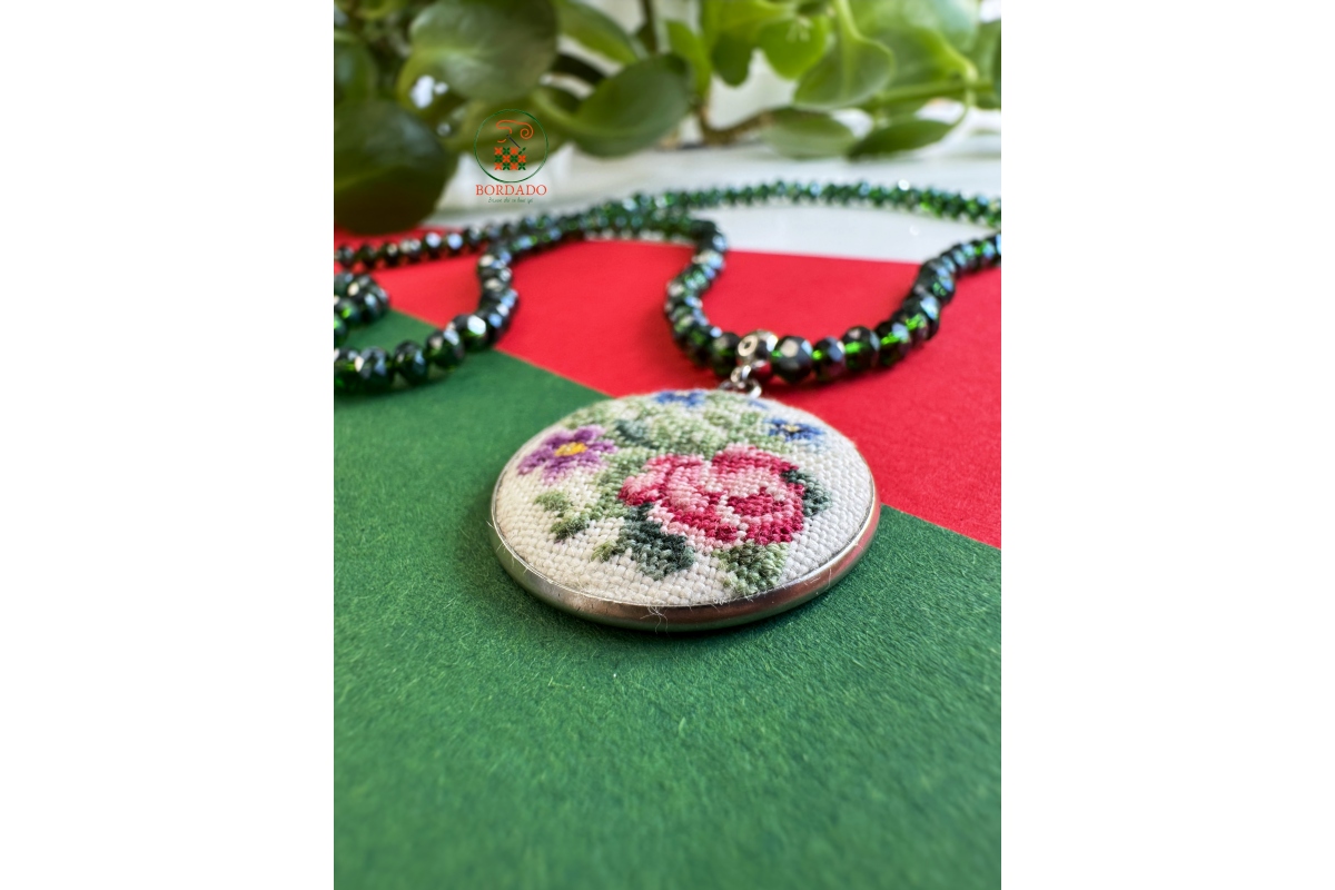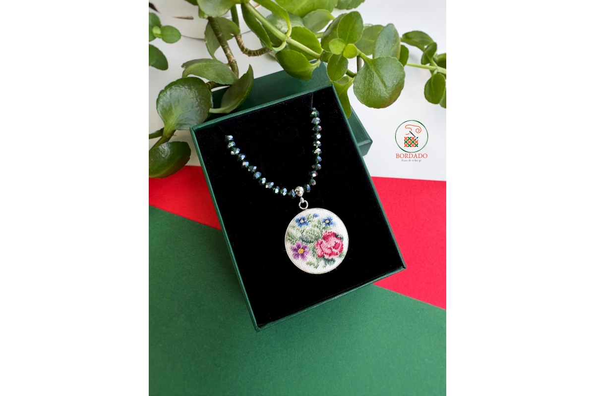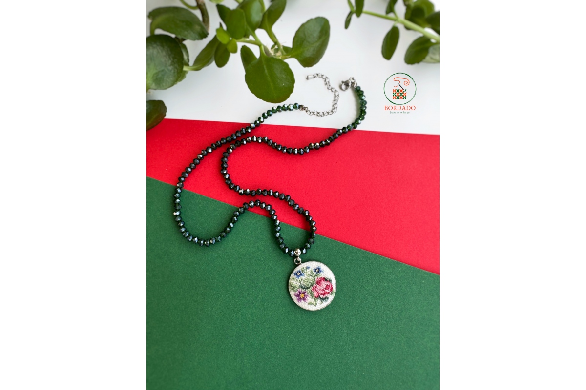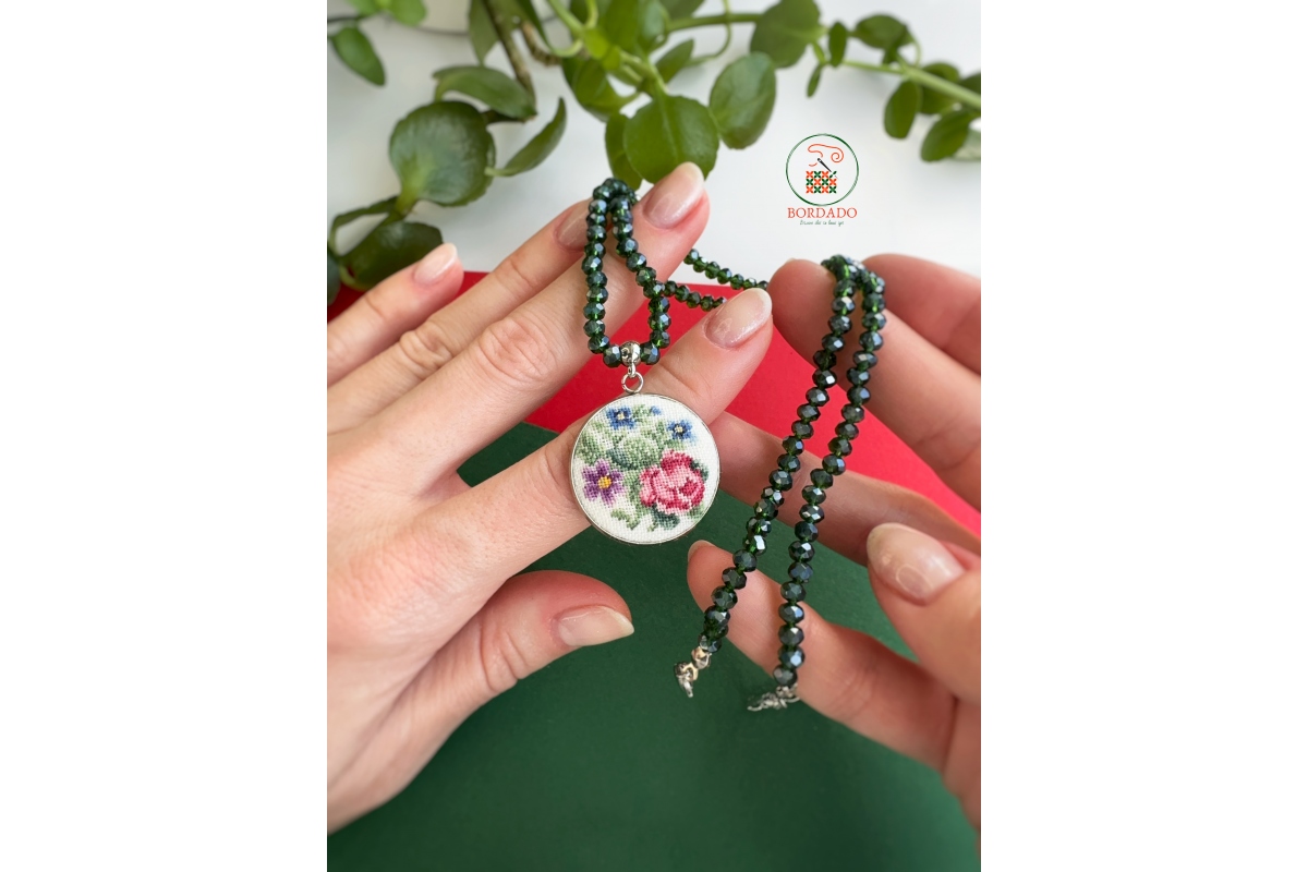 Намиста з підвіскою з ручною вишивкою (мікровишивка). Вишивка виконана на льяній тканині бавовняними нитками. Металева основа і фурнітура з нержавіючої сталі та застібкою-карабін. Намистини скляні.